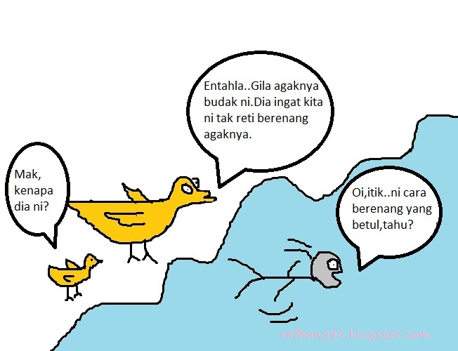 Maksud : Seorang perenang negara menunjukkan kehebatannya berenang kepada semua penduduk termasuklah itik-itik di kampungnya.Beliau menganggap hanya beliau sahaja yang tahu berenang didunia ini.